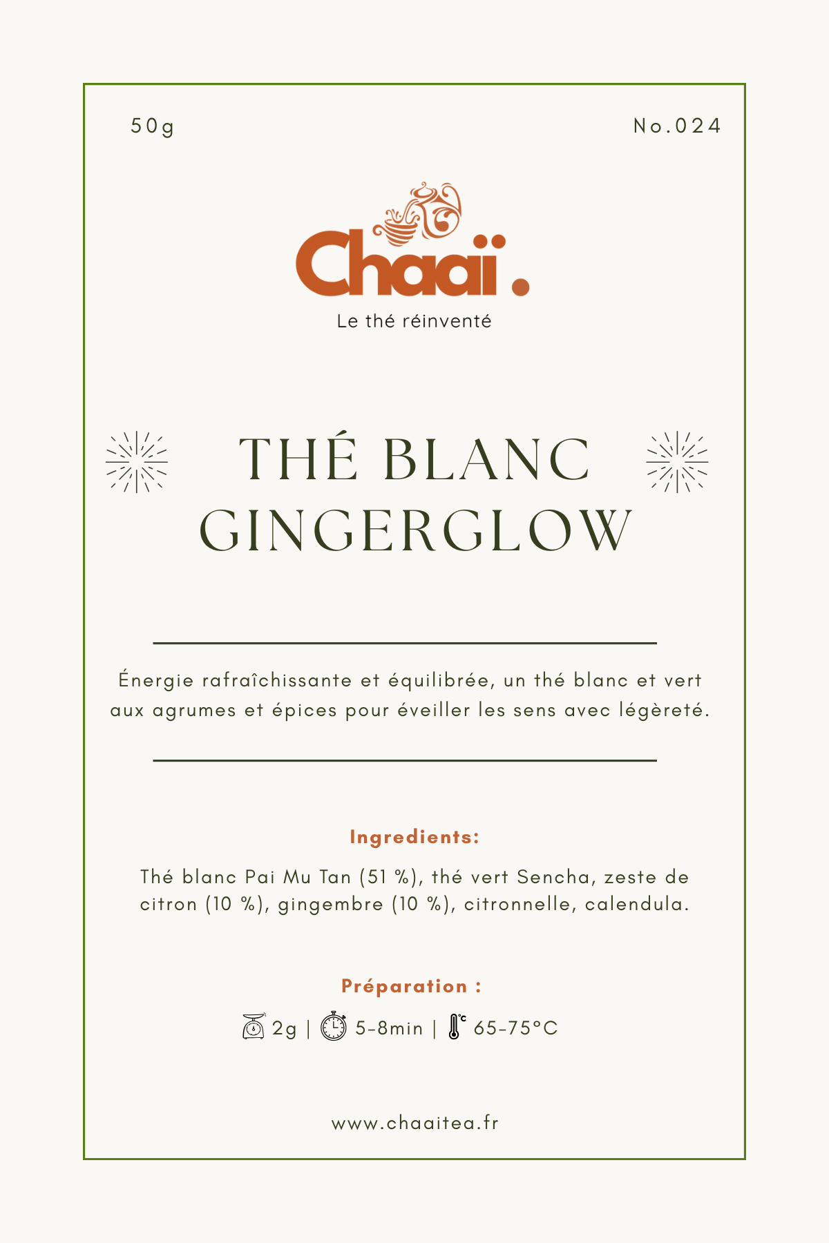 Ingrédients : Thé blanc Pai Mu Tan (51 %) de Chine, thé vert Sencha du Japon, zeste de citron (10 %), gingembre (10 %), citronnelle, calendula.